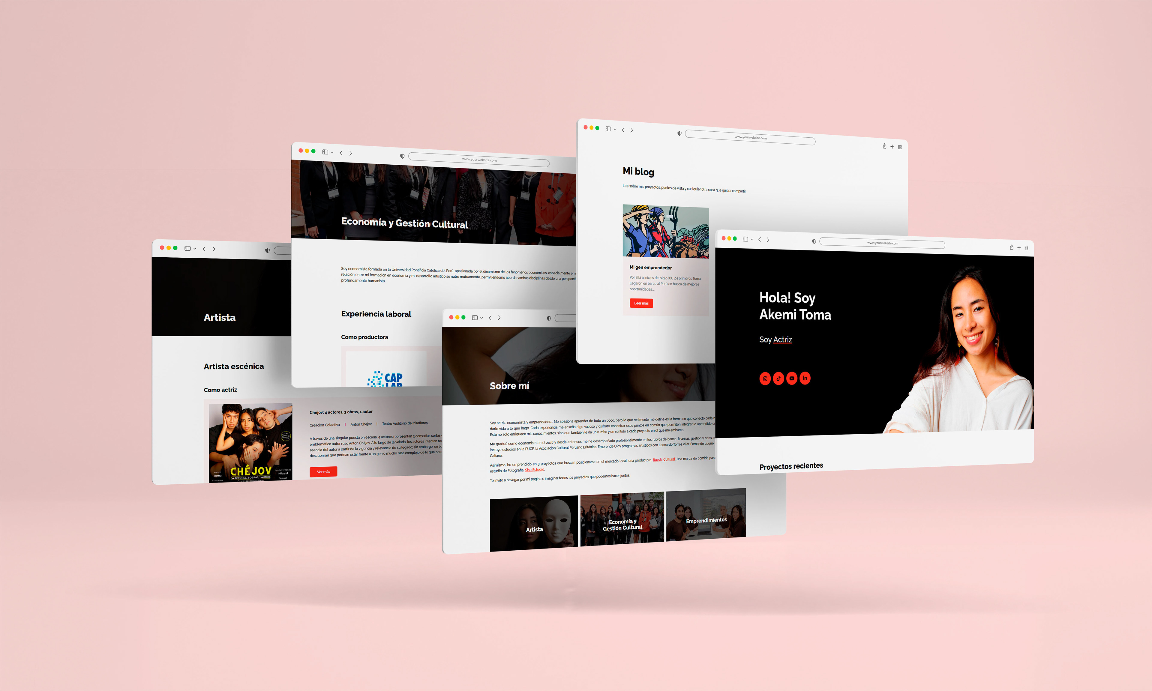 Enfoque: El objetivo principal de este proyecto fue crear una plataforma digital personal que funcione como portafolio profesional para Akemi Toma que permita organizar su experiencia en diferentes rubros de manera ordenada y clara para quien desee contactarla.